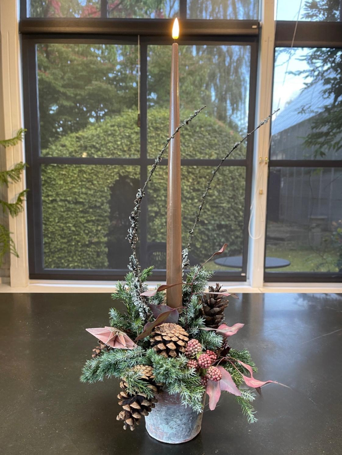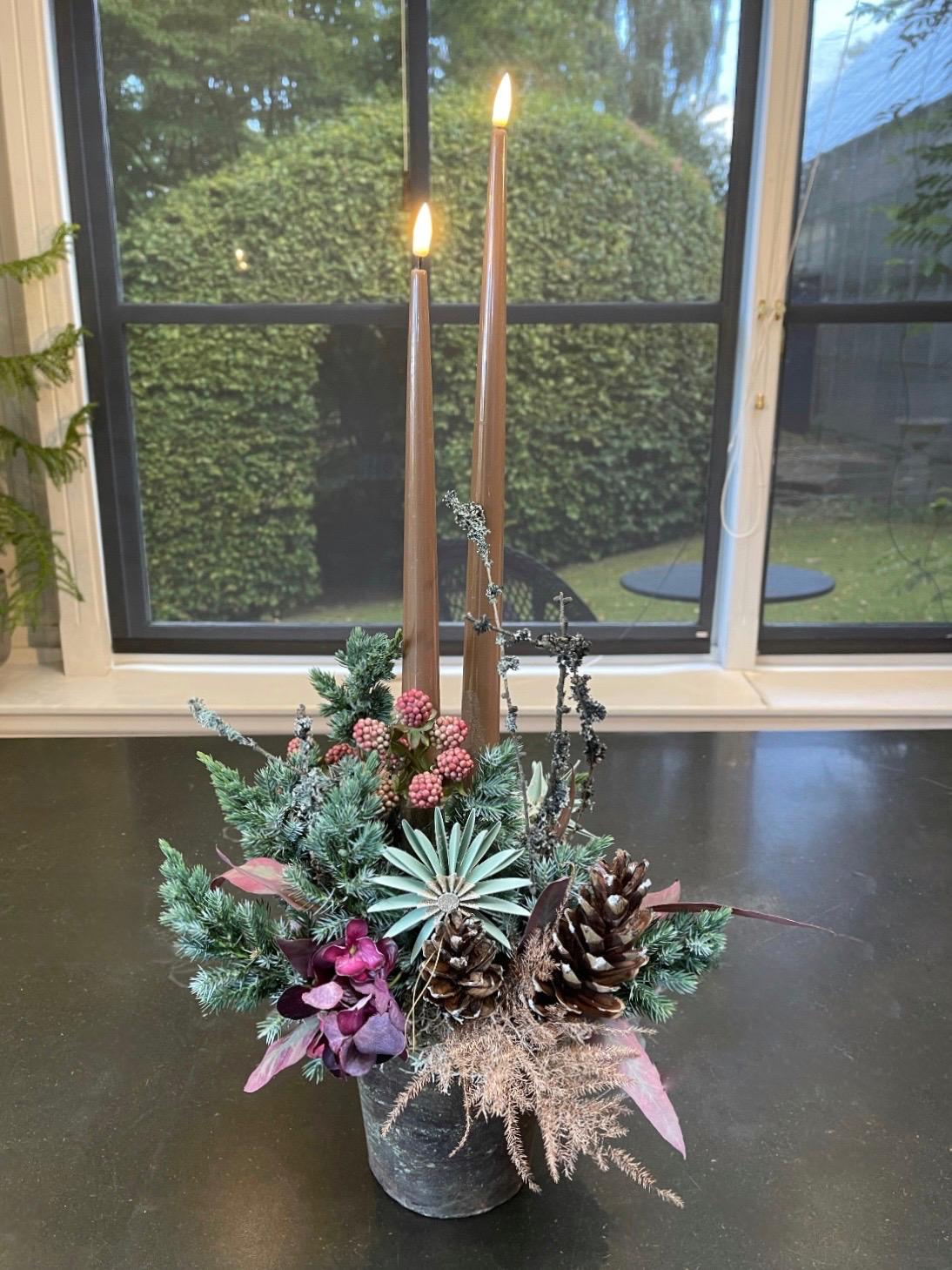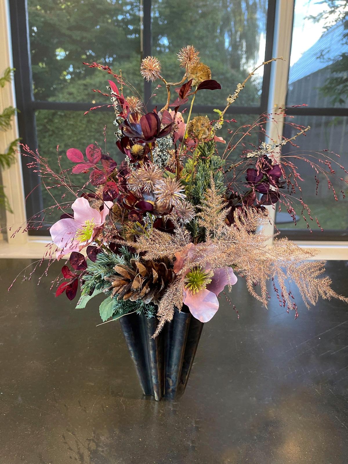 Årets nyhed er Julebuketter. Disse leveres i 3 størrelser, med tilhørende smukke vaser i bruneret messing. Buketterne består af et miks af levende grønt, tørrede blomster og græsser samt smukke silkeblomster i fineste og meget naturtro kvalitet.