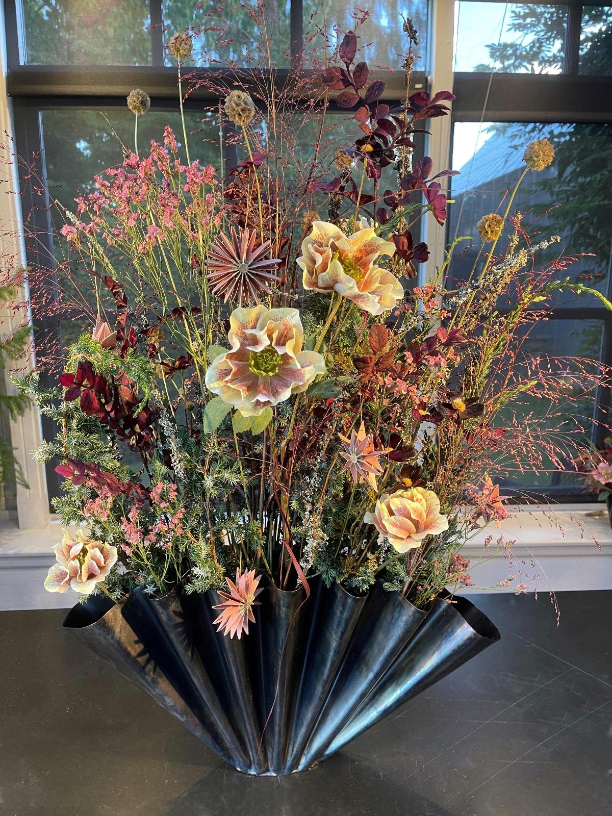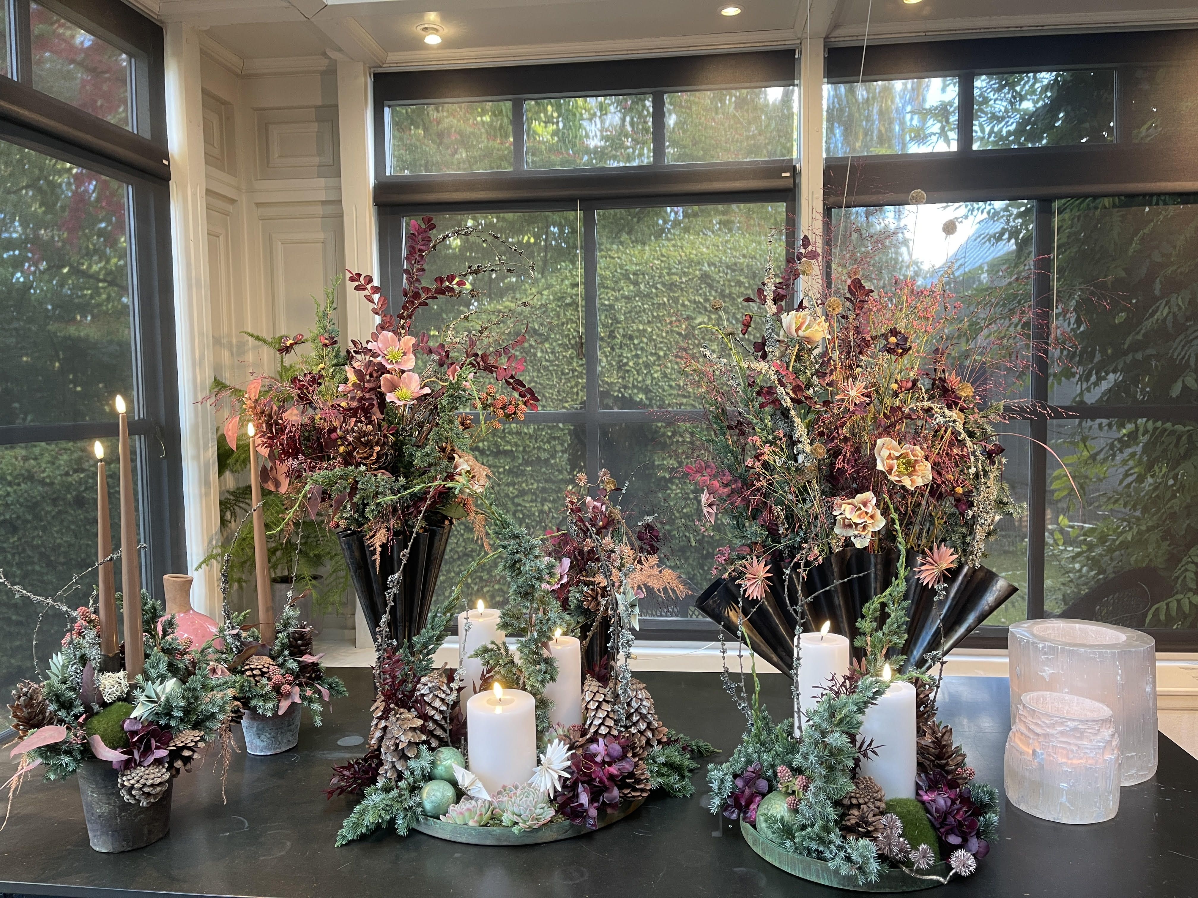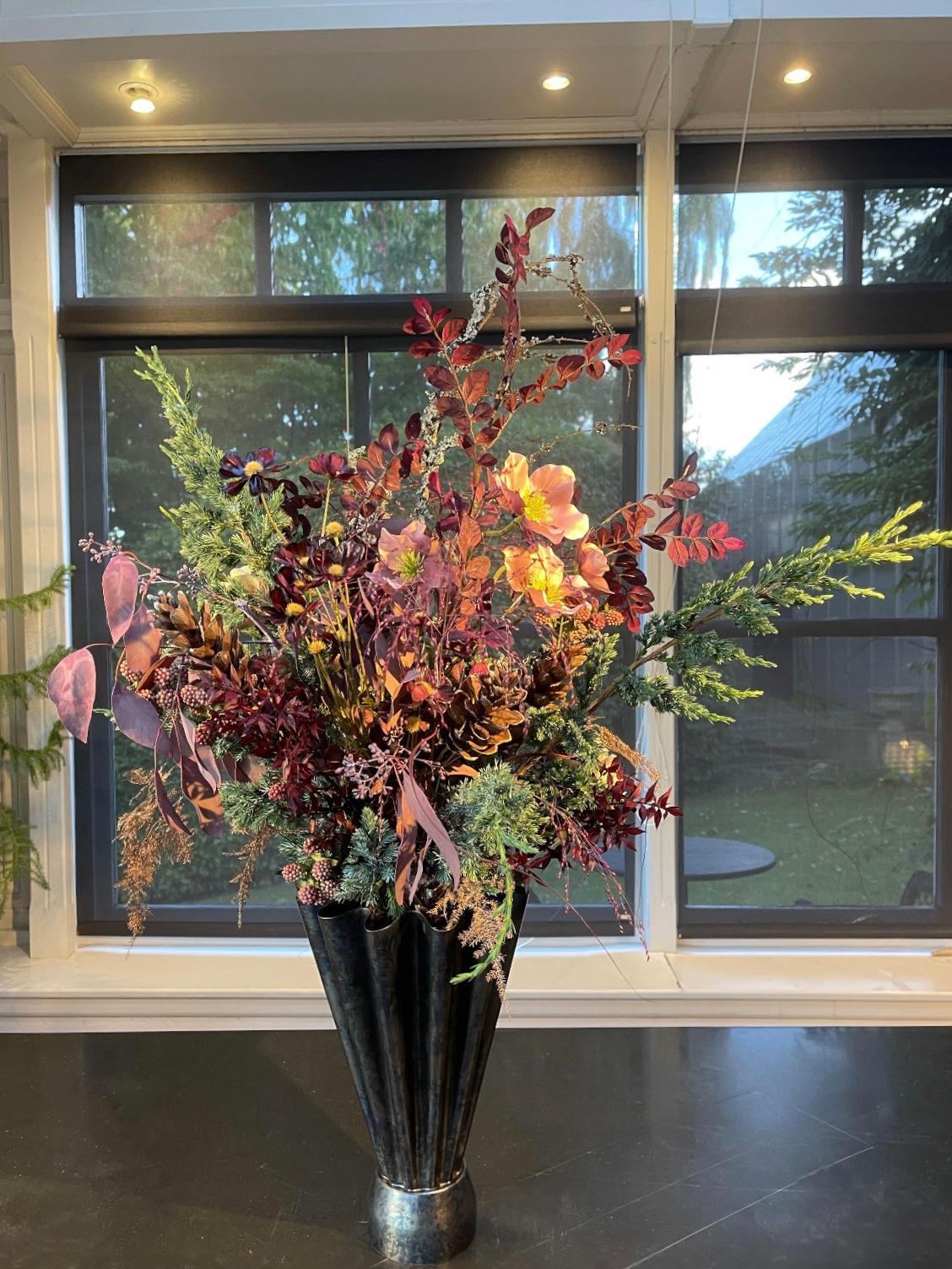 Årets nyhed er Julebuketter. Disse leveres i 3 størrelser, med tilhørende smukke vaser i bruneret messing. Buketterne består af et miks af levende grønt, tørrede blomster og græsser samt smukke silkeblomster i fineste og meget naturtro kvalitet.