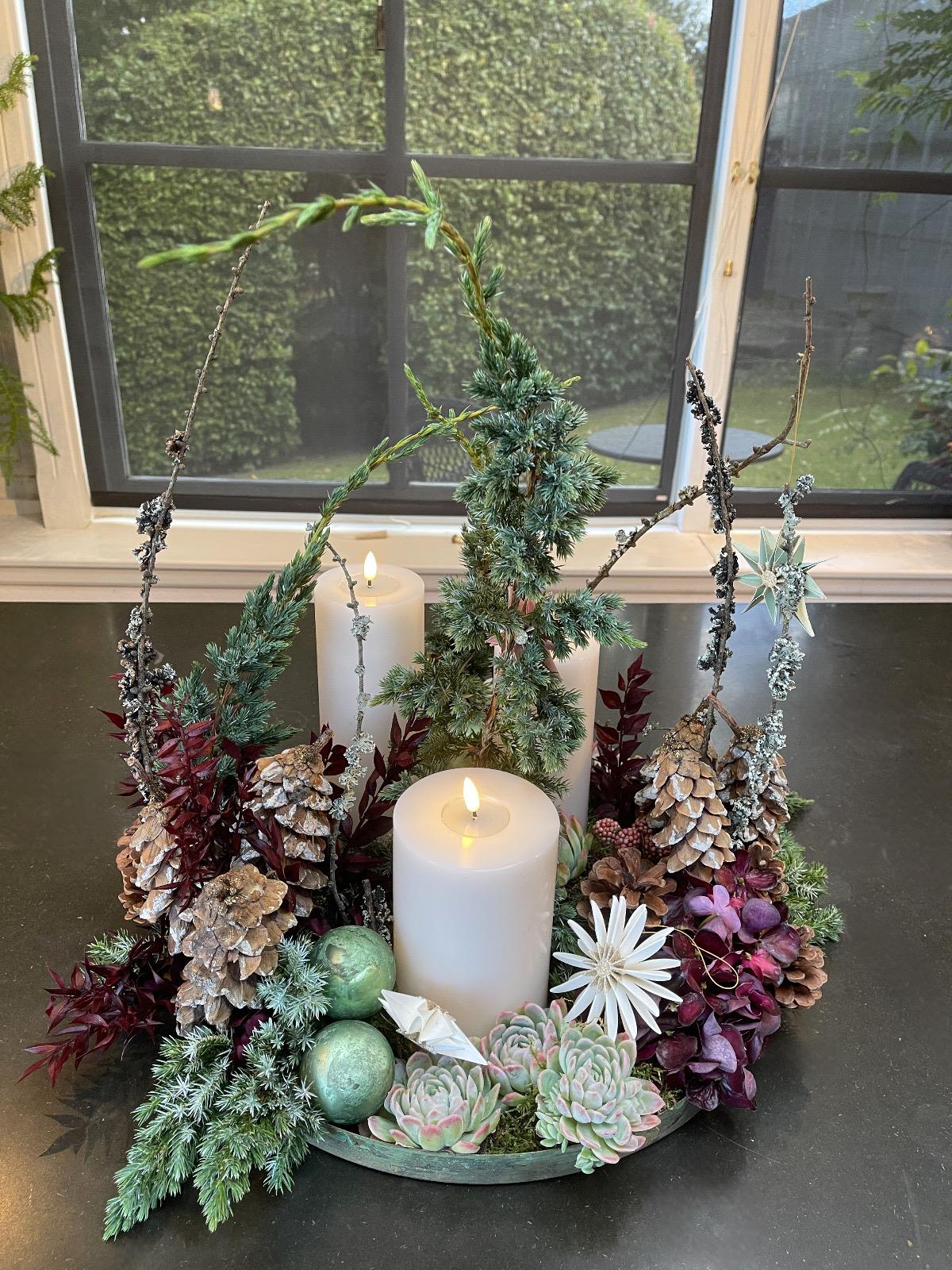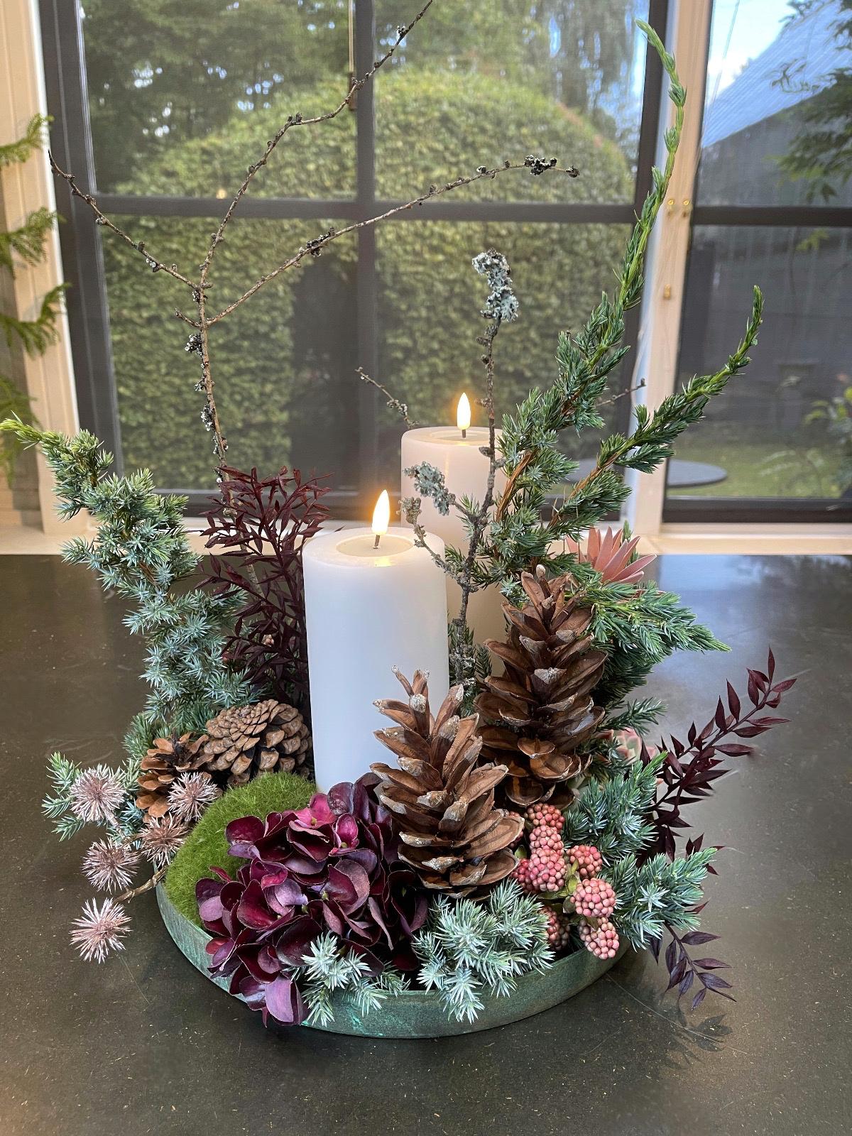 Årets juledekorationer er i rødlige toner og de er fyldt med naturlige materialer som kogler, smukke grene og Husløg. Som noget nyt har vi i år tilføjet Julebuketter til vores sortiment.